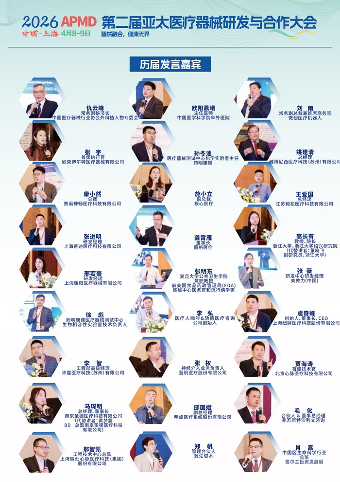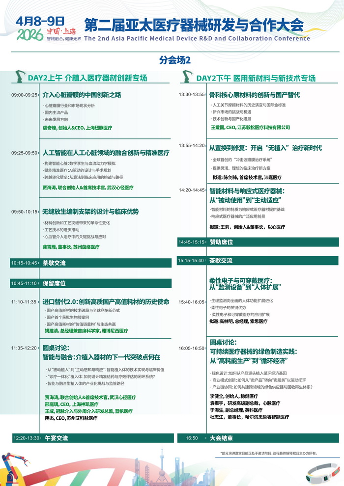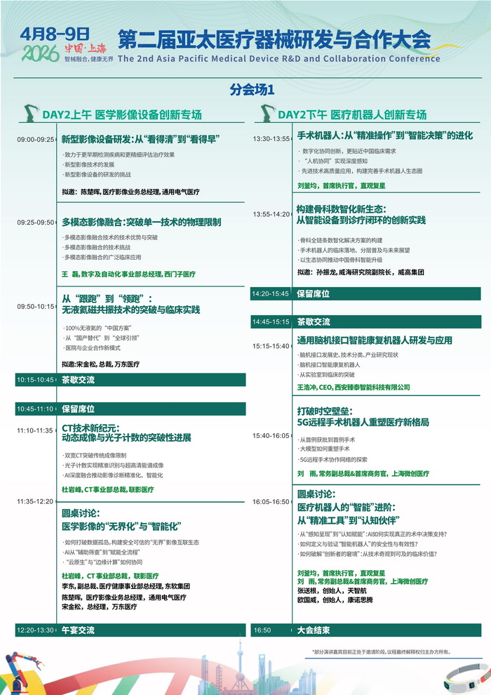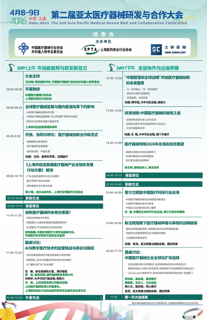 在此背景下,2026 第二届亚太医疗器械研发与合作大会作为亚太地区医疗器械领域的标杆性盛 会,将于4月 8-9日在上海召开。本届大会聚焦监管合规、出海战略、研发创新、AI 赋能及供应链优化 等核心议题,助力企业突破创新瓶颈、把握全球机遇,旨在搭建产学研医资深度融合的创新平台,推动 中国医疗器械产业从“规模扩张”向“价值创造”跃迁。