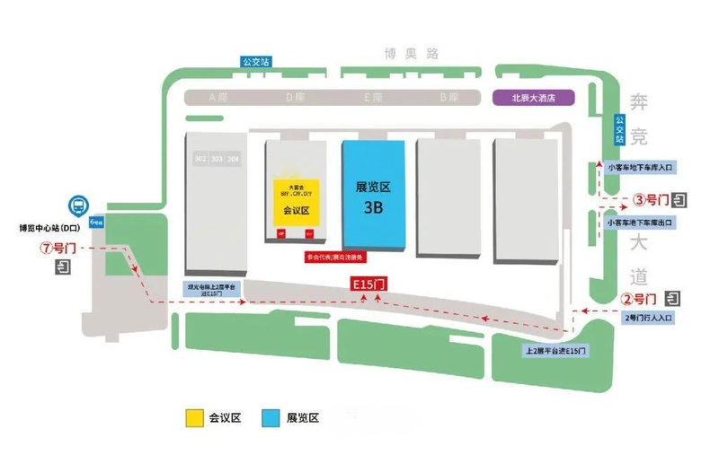 3、出租车/网约车:导航至【杭州国际博览中心7号门】或【杭州国际博览中心2号门】,步行前往二层平台,从【E15】号门进入展馆,乘扶梯前往3层。
