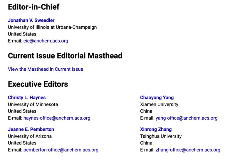 目前,Analytical Chemistry 编辑团队中来自中国内地高校的成员包括:清华大学教授、北京市理化分析测试中心主任张新荣和厦门大学的杨朝勇教授担任执行主编;中国科学院杭州医学研究所方晓红研究员、厦门大学任斌教授、湖南大学张晓兵教授以及中国科学院大连化学物理研究所张丽华研究员担任副主编。
