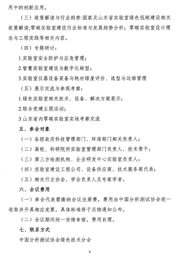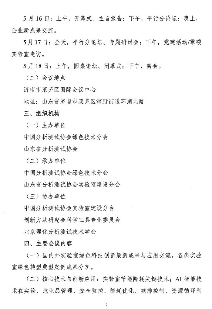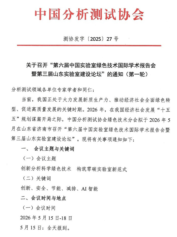 当前,我国正处于大力发展新质生产力、推动经济社会全面绿色转型、促进高质量发展的关键时期。2026年,在我国经济社会发展“十五五”规划谋篇开局之际,中国分析测试协会绿色技术分会拟于2026年5月在山东省济南市召开“第六届中国实验室绿色技术国际学术报告会暨第三届山东实验室建设论坛”。
