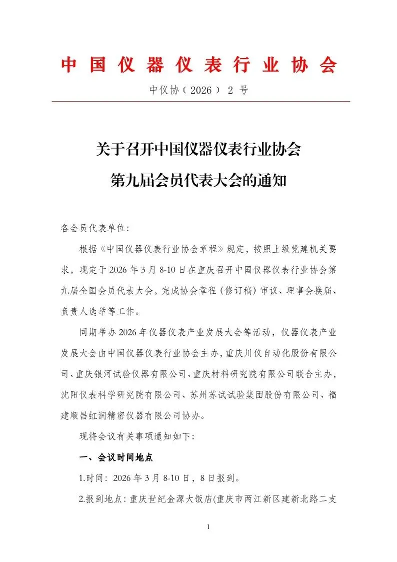 根据《中国仪器仪表行业协会章程》规定,按照上级党建机关要求,现定于2026年3月8-10日在重庆召开中国仪器仪表行业协会第九届全国会员代表大会,完成协会章程(修订稿)审议、理事会换届、负责人选举等工作。