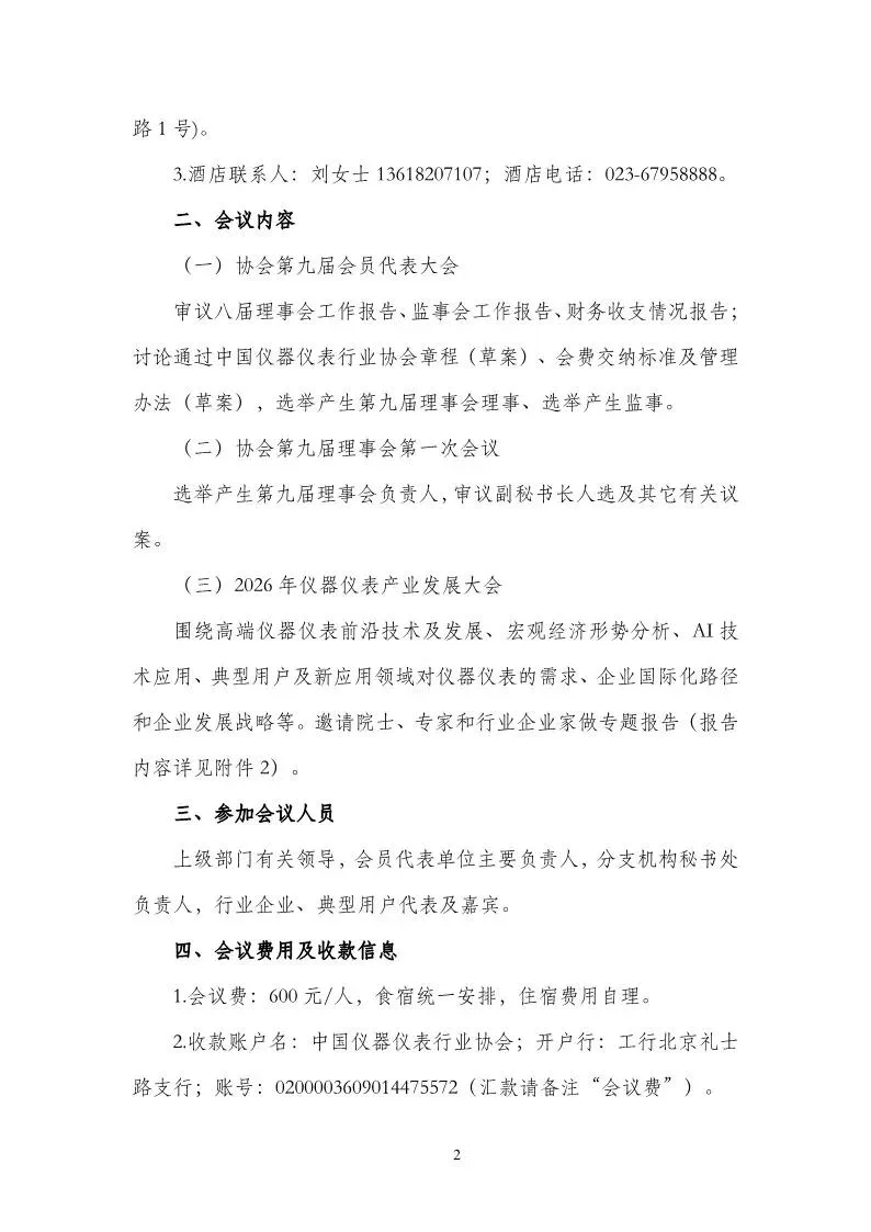 2.收款账户名:中国仪器仪表行业协会;开户行:工行北京礼士路支行;账号:0200003609014475572(汇款请备注“会议费”)。