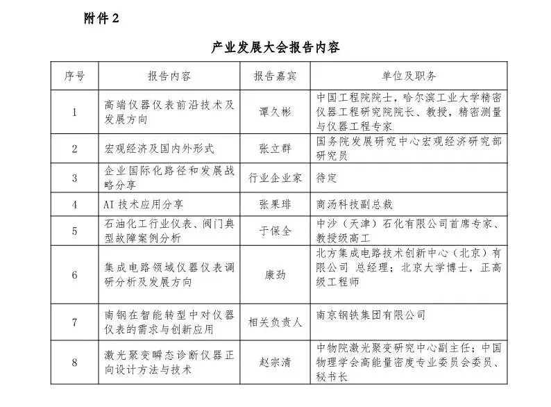 围绕高端仪器仪表前沿技术及发展、宏观经济形势分析、AI 技术应用、典型用户及新应用领域对仪器仪表的需求、企业国际化路径 和企业发展战略等。邀请院士、专家和行业企业家做专题报告(报告内容详见附件2)。
