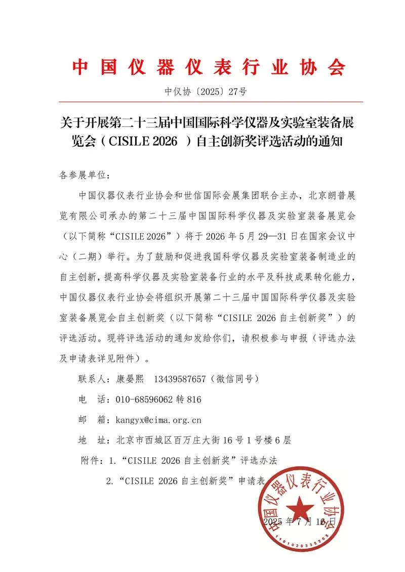 中国仪器仪表行业协会和世信国际会展集团联合主办,北京朗普展览有限公司承办的第二十三届中国国际科学仪器及实验室装备展览会 (以下简称“CISILE 2026”)将于 2026 年 5 月 29-31 日在国家会议中心(二期)举行。为了鼓励和促进我国科学仪器及实验室装备制造业的自主创新,提高科学仪器及实验室装备行业的水平及科技成果转化能力,中国仪器仪表行业协会将组织开展第二十三届中国国际科学仪器及实验室装备展览会自主创新奖(以下简称“CISILE 2026 自主创新奖”)的评选活动。现将评选活动的通知发给你们,请积极参与申报(评选办法及申请表详见附件)。