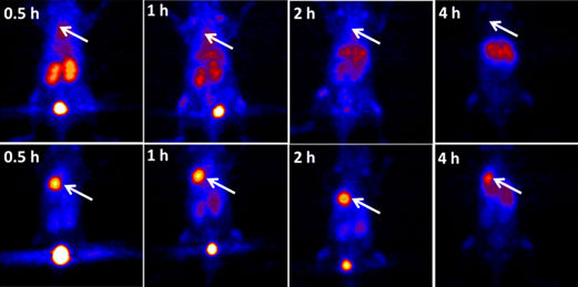 − 肿瘤成像研究:分别注射6.7MBq的非靶向[64Cu]CuNC@BSA(上)、靶向[64Cu]CuNC@BSA-LHRH(下),PET成像显示靶向药物在模型鼠肺部肿瘤处有特异性浓集;
