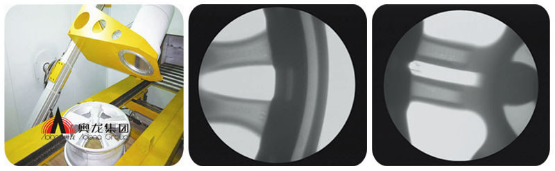 轮毂X射线检测系统由高频X射线机、X射线数字平板探测器、轮毂检测专用机械装置,计算机图像处理系统、控制装置和铅防护房组成。该系统可迅速准确检测出轮毂各部位的气孔、裂纹、疏松等缺陷。