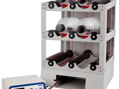 该小型滚瓶机适用于小批量生物样品的开发和研究,可以安装在试验台上,也可以放置于生物培养箱中。可以同时放置 6 个 2000mL 滚瓶