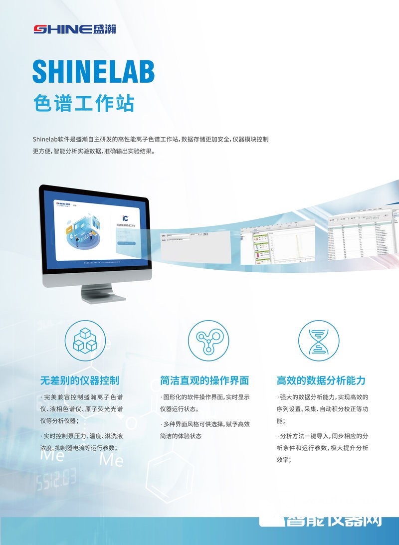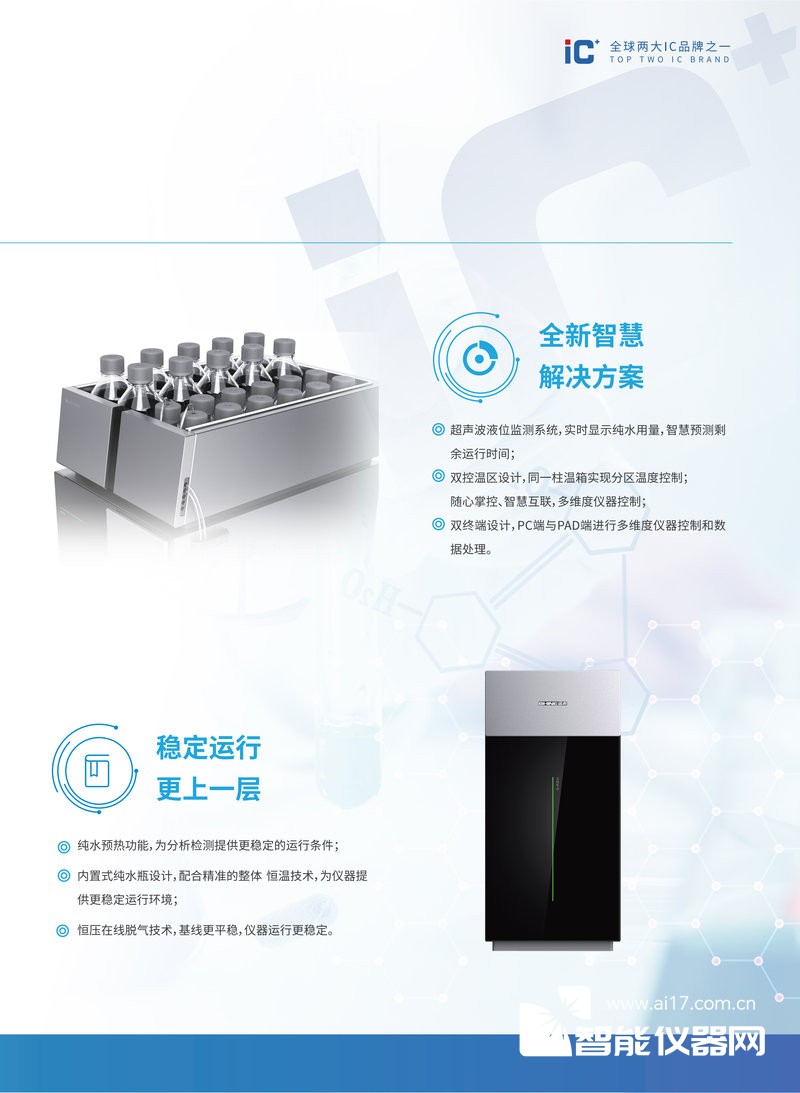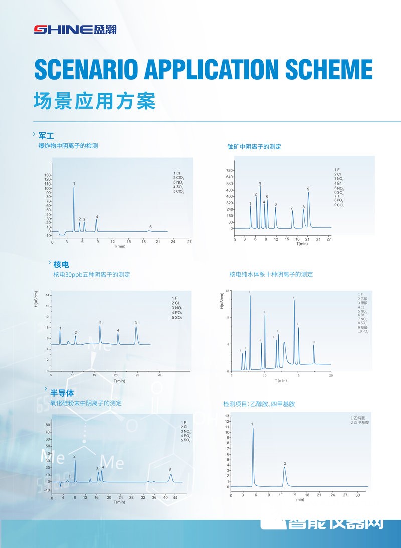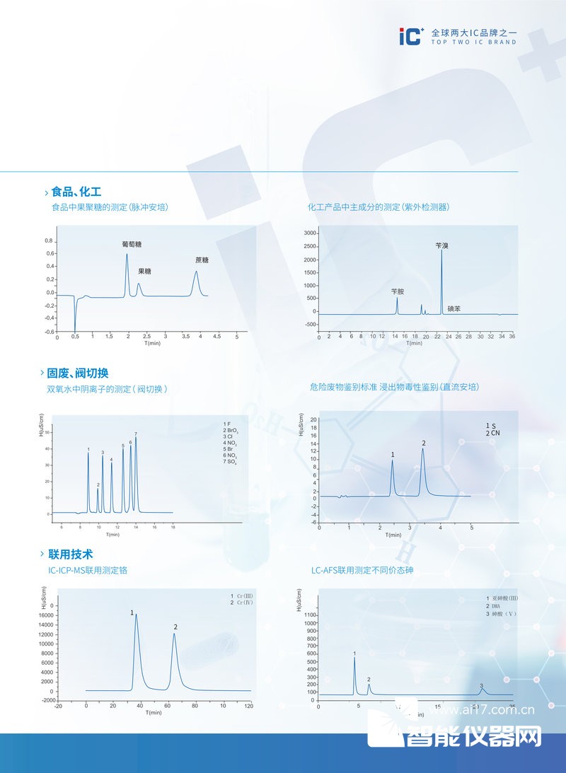 (1)双通道系统,两个通道独立运行互不干扰,完成阴/阳离子检测的同时,可以进行硫离子、碘离子等组分的分析;