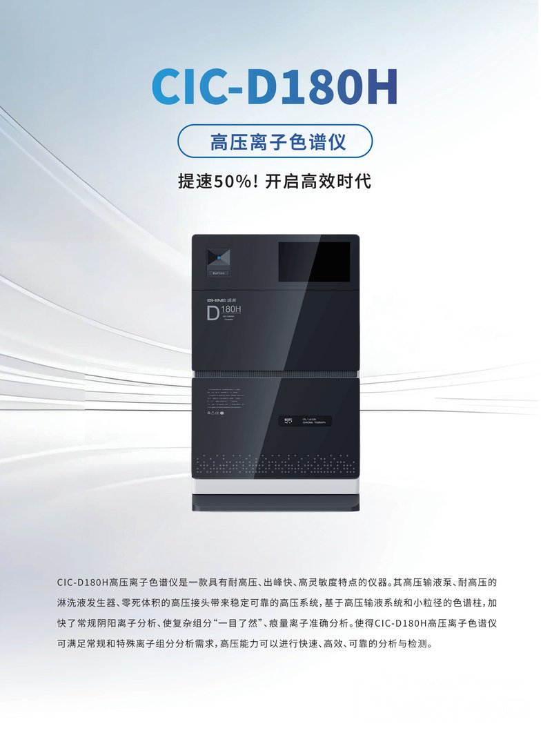 CIC-D180H高压离子色谱仪是一款具有耐高压、出峰快、高灵敏度特点的仪器。其高压输液泵、耐高压的淋洗液发生器、零死体积的高压接头带来稳定可靠的高压系统,基于高压输液系统和小粒径的色谱柱,加快了常规阴阳离子分析、使复杂组分“一目了然”、痕量离子准确分析。使得CIC-D180H高压离子色谱仪可满足常规和特殊离子组分分析需求,高压能力可以进行快速、高效、可靠的分析与检测。