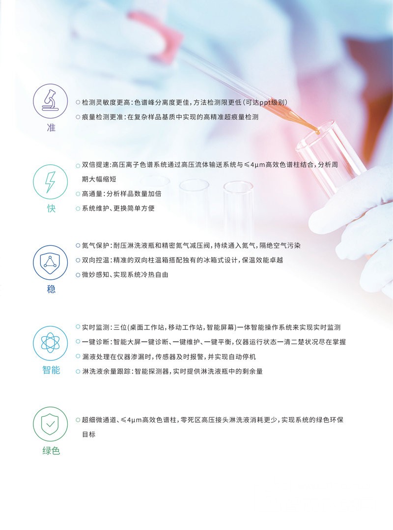超细微通道、<4um高效色谱柱,零死区高压接头淋洗液消耗更少,实现系统的绿色环保目标
