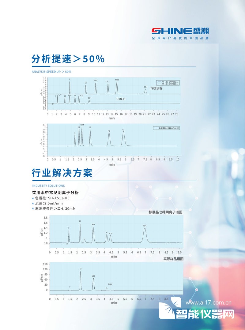 双倍提速:高压离子色谱系统通过高压流体输送系统与≤4µm高效色谱柱结合,分析周期大幅缩短